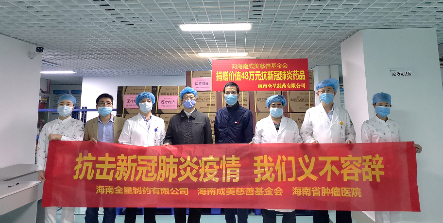 在全省上下疫情防控關鍵時期,海南全星制藥有限公司始終不忘履行社會責任,繼25日向海口市紅十字會捐贈107萬元的抗疫藥品后,全星再行動,27日,向海南成美慈善基金會捐贈價值48萬元的抗疫藥品,用于支持海南省腫瘤專科醫療聯合體下轄110多家醫療機構開展一線疫情防控工作,助力我省早日打贏疫情防控攻堅戰。